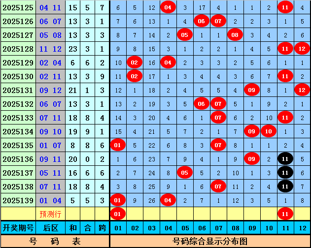 后分离析(一区01-04,二区05-08,三区09-12):上期后区开出奖号01和04,最近10期后区三区落号比为4:9:10,本期后区关怀号码01、03、06、08、11,后区两码参考01、11。